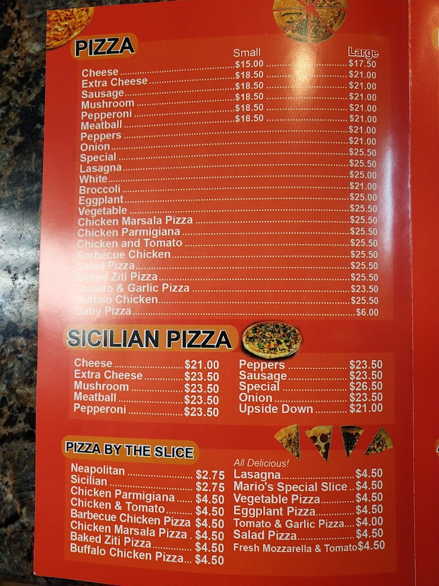 Welcome to Mario's Pizza - Jamaica, a culinary gem located at 14929 Guy R Brewer Blvd, Jamaica, NY. This vibrant pizzeria offers a menu bursting with flavor and variety, making it a go-to spot for pizza lovers. With their signature Sicilian pizzas, options like the Extra Cheese and Meatball pizzas captivate the palate, each priced at $28. For those seeking something classic, the Cheese Pizza at $20 is a delightful choice that showcases a perfect blend of sweet tomato sauce and melty cheese.